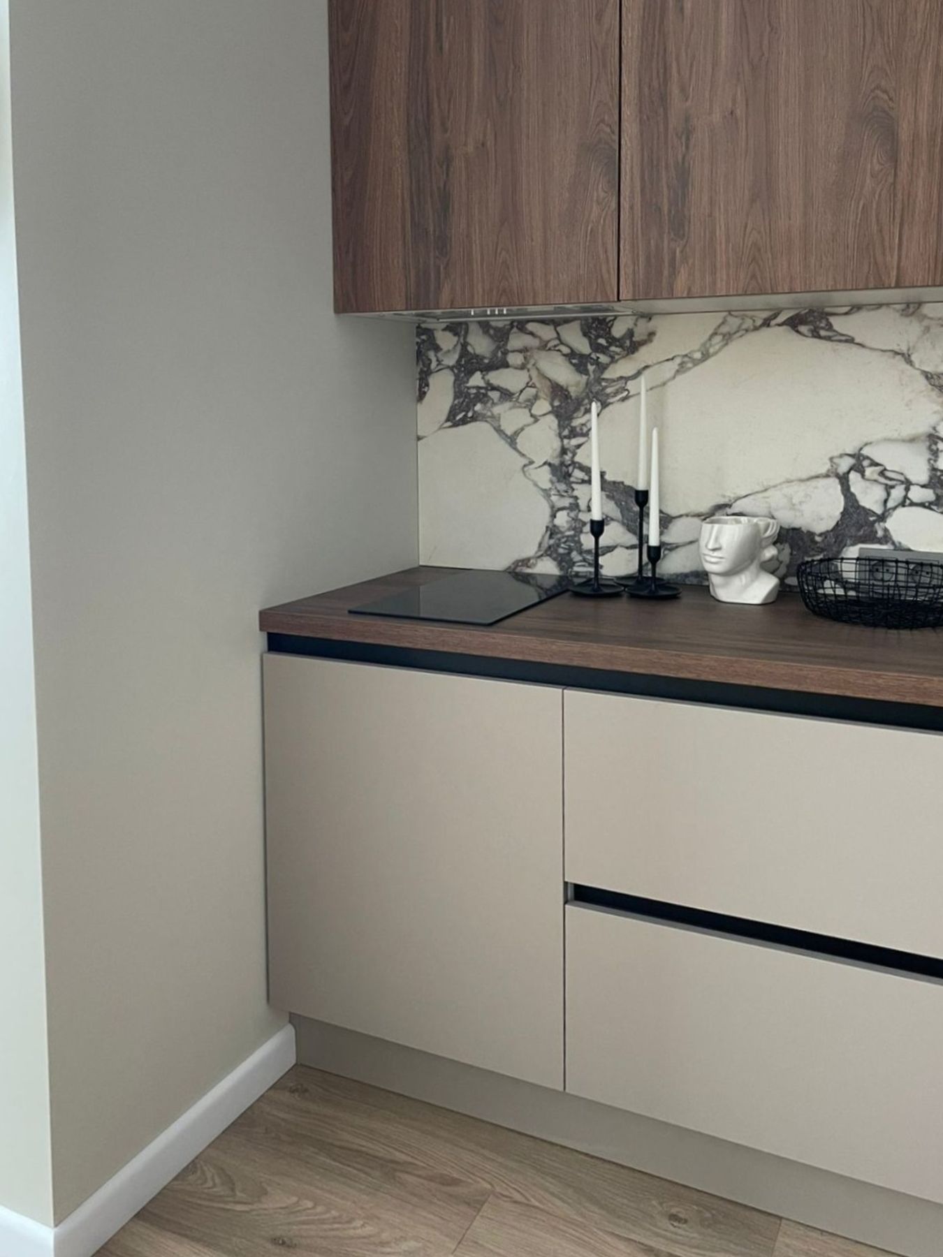Основой стал теплый нейтральный цвет «Кашемир», создающий спокойный и утонченный фон. Натуральное дерево в отделке или столешнице добавило интерьеру теплой текстуры и живой энергетики, что особенно ценно в городском жилье. Лаконичные формы, интегрированная техника и продуманные системы хранения позволили добиться безупречного вида в духе минимал люкс, без ущерба для удобства. В результате получилась кухня, которая выглядит дорого и сдержанно, превращая апартаменты в место силы и вдохновения.